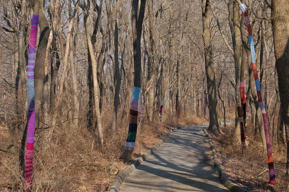 The exhibit, called "Cold Comfort," features 30 separate installations of brightly-colored "yarn bombs" covering tree trunks throughout the center's Widener Trail in Upper Roxborough. It's part of FiberPhiladelphia, an international festival for innovative fiber and textile art.